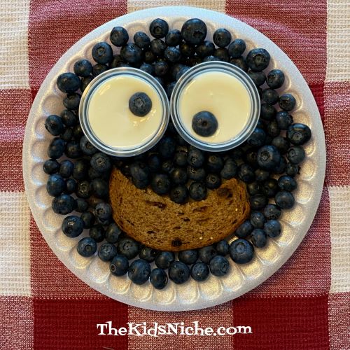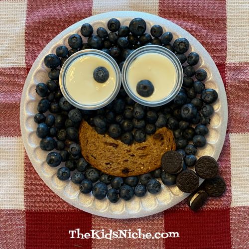 Place 1 large blueberry in each cup of yogurt to make the eyes. Fill the rest of the plate with blueberries. And you have your Cookie Monster! 🙂