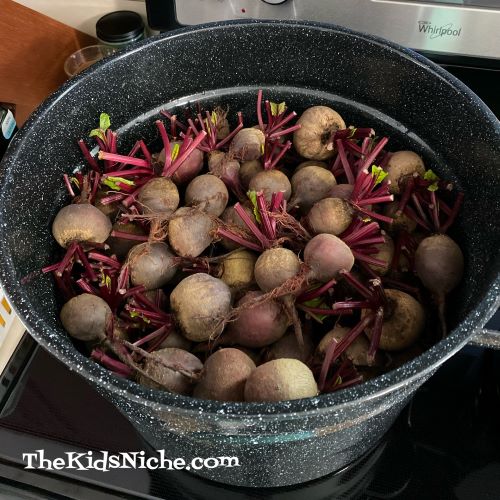 The water is brought to a boil and the red beets are cooked until the skin of the red beet will slide off the outside of the beet. The beets are then put into a large pan of cold water so they can cool. Once they are cool enough to be handled without burning your hands, each beet is gently “squeezed” and the skin, the root and the stem will slip right off.