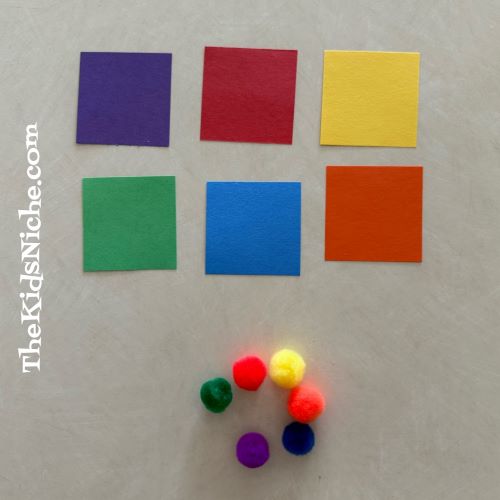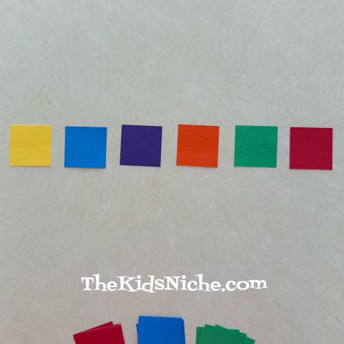 First, cut out squares from colored construction paper or similar. I went with 2 inch squares and the colors red, blue, orange, yellow, green and purple. You will want 8-10 squares of each color.