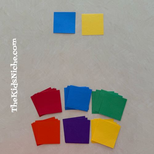 Separate each color into 2 piles with 4-5 squares of each color. One pile of each color goes to the adult playing and one pile of each color goes to the child playing. The more players you have, the more squares you will need to make.