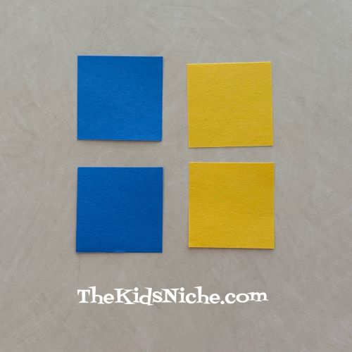 The games you choose to play will be decided by the age of the children playing. I will show you different games that you can make easier or harder to fit your child’s age. We’ll start with a very simple game. The adult places 1-2 colored squares in front of the child. In this picture we’re using 1 blue square and 1 yellow square.