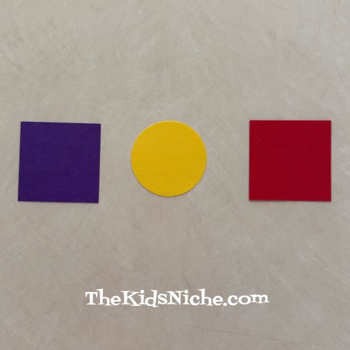 Not only does the child need to match the shape but also match the color. For instance, a purple square, a yellow circle and a red square…even though they have 2 shapes with different colors, they need to find the ones that match.