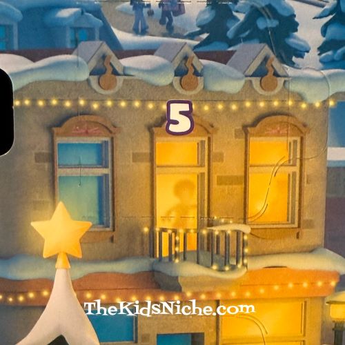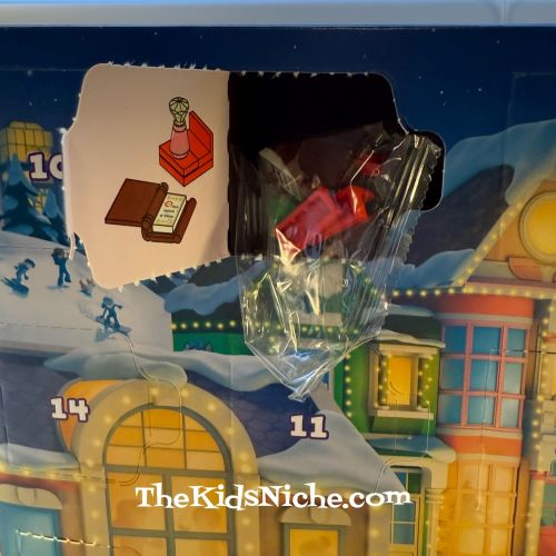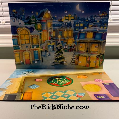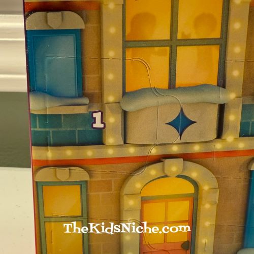 There are several Lego Advent calendars to choose from including Disney Frozen, Harry Potter, Minecraft, City, Star Wars and Friends. Each calendar includes 24 surprise gifts. On the back of the box is an extra flap that lays down to give you some scenery to arrange your assembled gifts on. The Lego Friends calendar has a sleepover scene this year.
