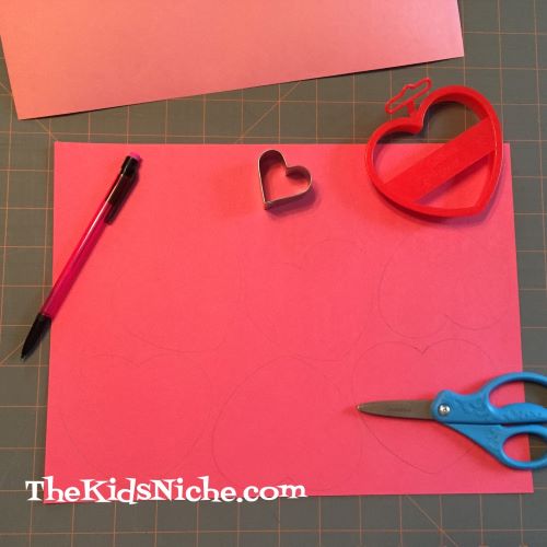 First thing to do is to make 1 large heart and 4 small hearts out of the red or pink paper. I traced around cookie cutters.