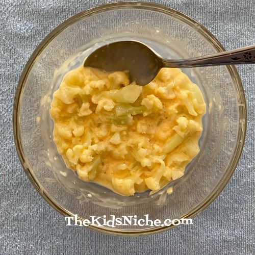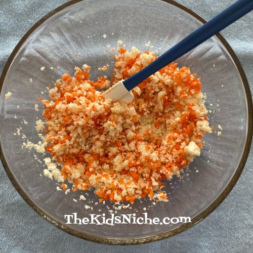 Next, place the cauliflower, 2 Cups of cheese and 2 eggs into a large bowl. (We have used 1 Cup of mozzarella and 1 cup of parmesan cheese and that works fine too.)