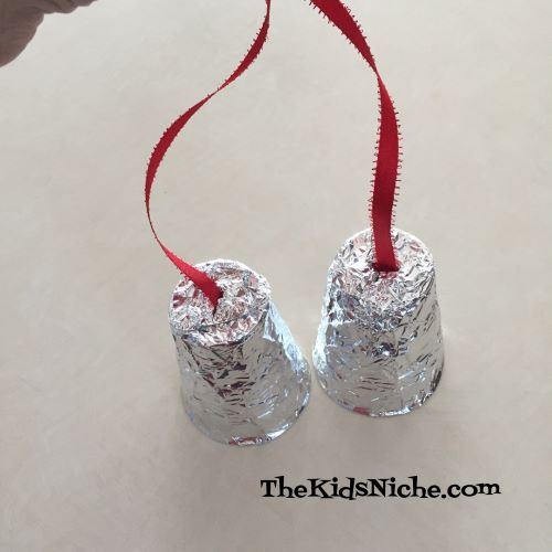 Long ago when I was little, we did a Christmas craft that was my favorite Christmas decoration to make…Christmas bells! I was always so proud of the bells I made and my mom would let me hang them around our house. Its another quick and easy craft, so let’s gather up the few supplies we need and get started! Grab some foil, some disposable cups and some ribbon. When I was a child, we made these using the 5 oz. Dixie paper cups but since I didn’t have that size on hand, I used the 9 oz. plastic cups.