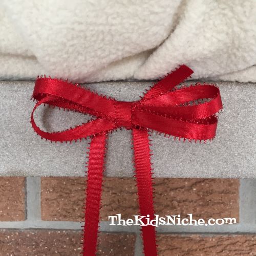 Spread another line of glue and put the first white piece of topper at the top of the stocking. Turn the stocking over and spread another line of glue for the second piece of topper. Hold for a few seconds again.