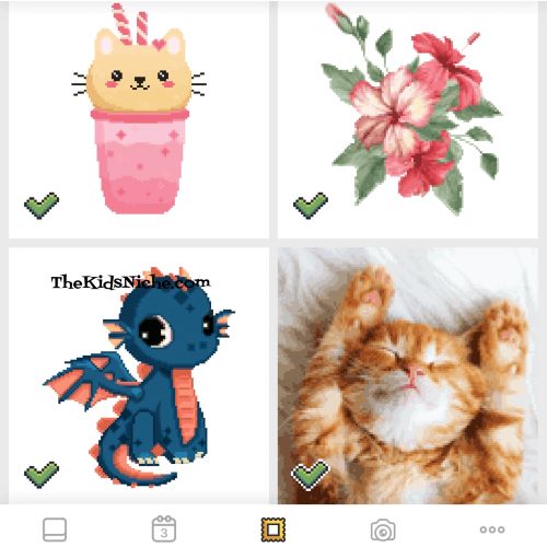 Pixel Art is a great app for coloring without the mess of carrying along crayons or colored pencils, a coloring book, something solid for under the book, etc. It’s something nice and calming to do on your tablet or phone that doesn’t involve shooting anything. 😉 I enjoy using this app as much as my grand kids. Our granddaughter has been playing it since she was 4 years old. Our grandsons play it too and a couple of them are teenagers. It’s great for all ages! Once you download the app, the first thing you’ll do is select a picture you would like to color. There are a lot of pictures to choose from! Just scroll down to see them.