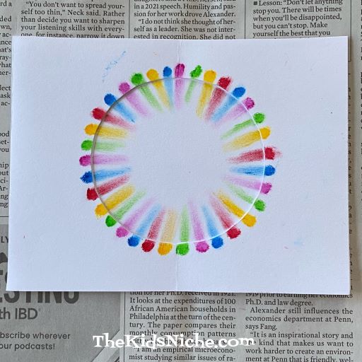 Pick out 3-5 colors that you want to use. Begin by coloring dots on the edge of your stencil. I like using colors in the same order all around the edge of the stencil. It’s great practice for the kids to help learn about making a pattern.