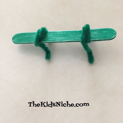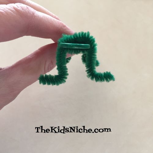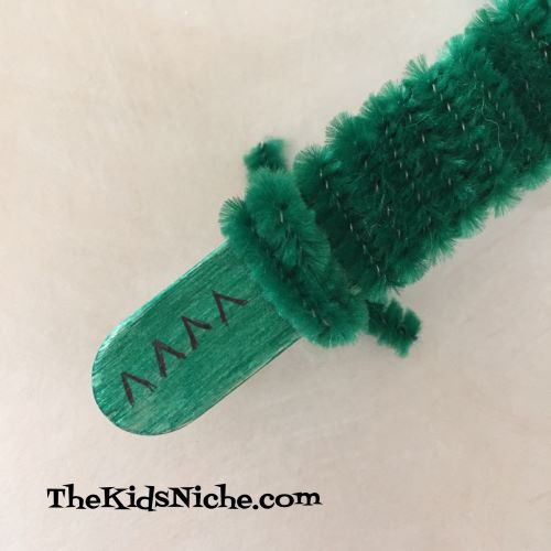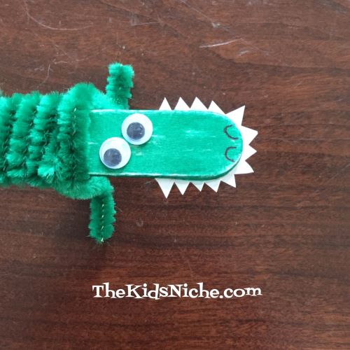 Take 1 green pipe cleaner and cut it in half. Use each piece to make the alligator’s legs by wrapping it around the stick and bending the ends a little to look like his feet.