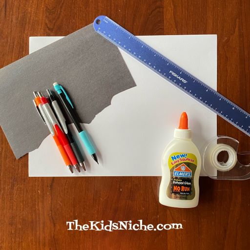 All you need to get started is some white paper, a small scrap of black paper, a pencil, a ruler, scissors, glue or double sided tape and some colored pens or makers.