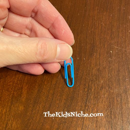 If you would like to be able to hang your paper chain snowman up, perhaps on your Christmas tree, you’ll need a piece of string or a paper clip. If you use string, just fold the string in half and tape the ends to the back of the snowman’s head. I’ll show you how to use the paper clip.