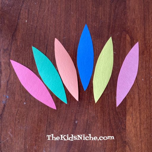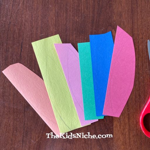 Trace around the feather pattern on several different colors of paper. I used 6 different colors but if you don’t have that many colors, make more than one of the colors you have so you end up with 6 feathers.
