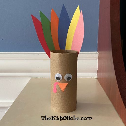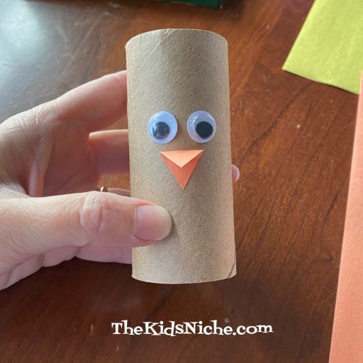 If you would like to color your turkey’s body (the toilet paper roll) with the markers, go ahead and do that first. I decided since the toilet paper roll was already brown, I would use it as is. Glue the wiggly eyes onto the turkey’s body.