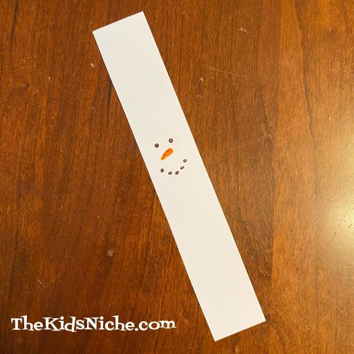 Take 1 strip of white paper and draw a snowman’s face in about the middle of the strip of paper.