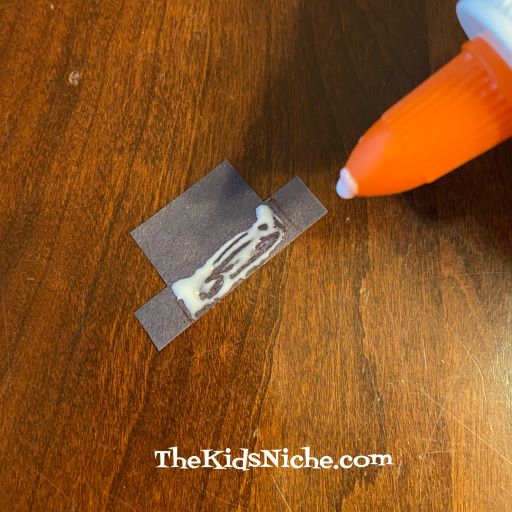 Using either tape or glue, again fasten the ends together in a circle. Continue adding strips of white paper until your snowman is as long as you’d like him to be.