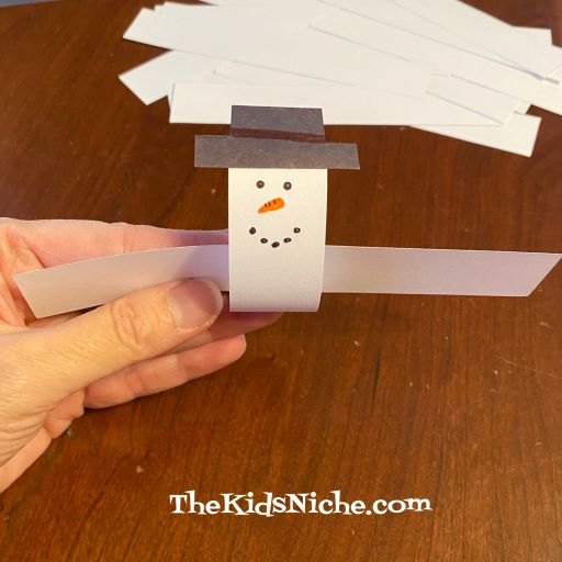 Now you will add a few other strips of the white paper to make a chain. To do this, slide one strip through the snowman’s head, as shown in the next picture.