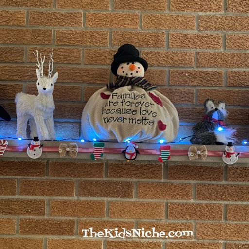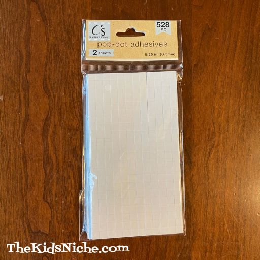 The weight of the puffy stickers made the stickers want to lean forward when I tried to hang the garland up. So I used some of these little dot adhesives to help hold my garland to our fireplace mantel. Depending on what type of stickers you use if you will need to do this step. (The pop-adhesive dots might not work well on painted walls so be careful where you use them.)