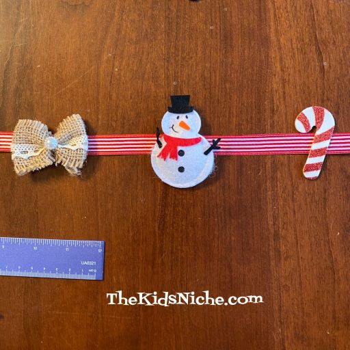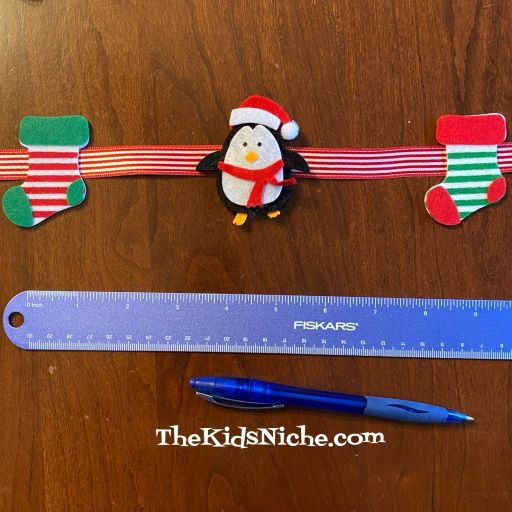 I used a ruler to measure from the center of the sticker to 4 inches in each direction. I made a small dot on the ribbon with a pen and that’s where I placed the next dot of glue from the glue gun.