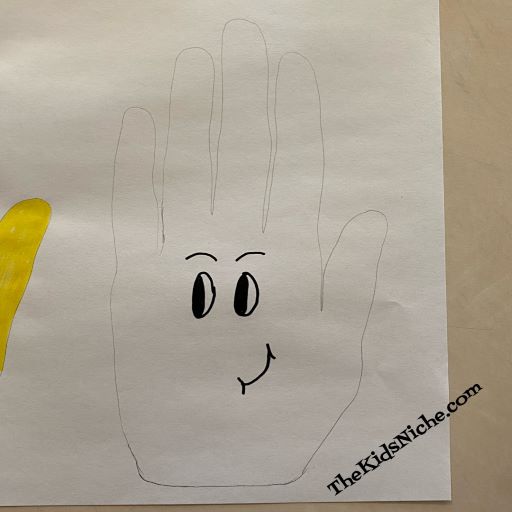 Hannah would like to have a friend, so let’s make a boy too. Trace around your hand again on the other side of the paper. Or on a new sheet of paper if the first one is out of space.