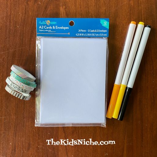 For this project you will need some blank cards and envelopes, a few different colors/patterns of Washi tape, scissors and some markers. You can pick whichever width of Washi tape you like and the number of different colors/patterns that you use, but I used 5 colors/patterns in about 1/4″ wide.