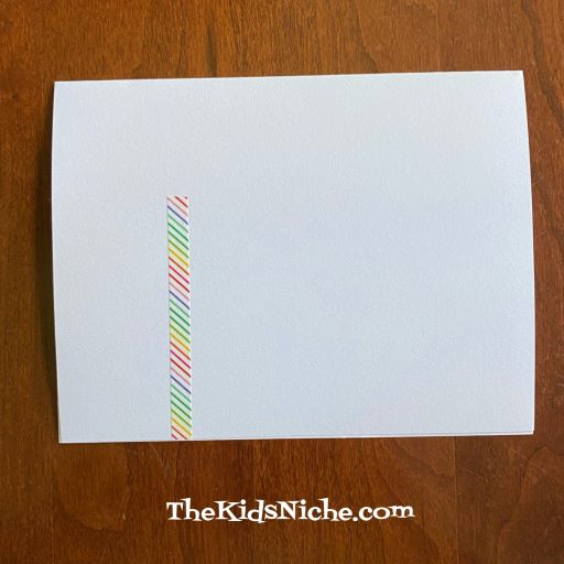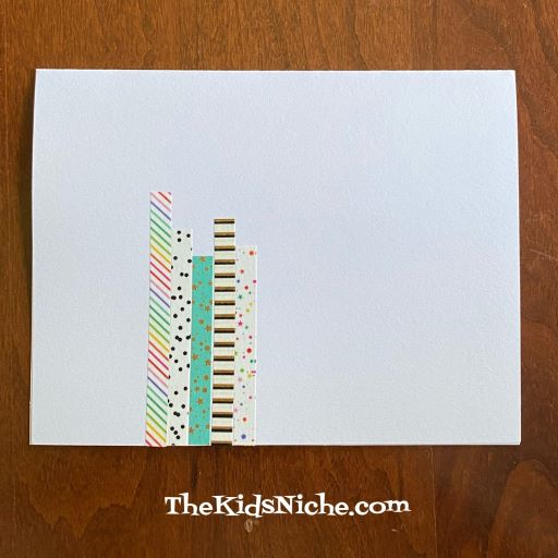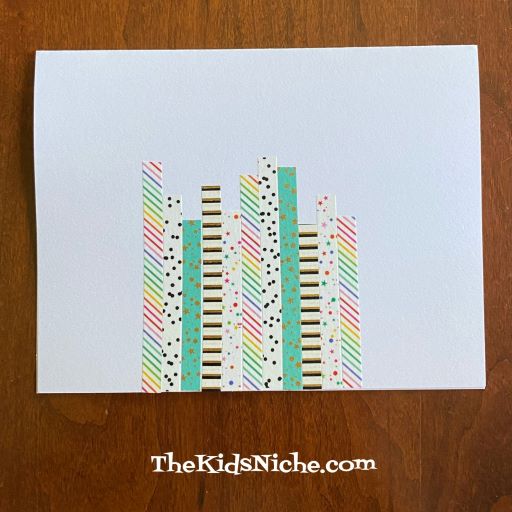 Continue cutting and placing strips of Washi tape in a line across the front of the card with each piece right up against the previous piece of tape. I like to vary the heights of the “candles” by using different lengths of tape.