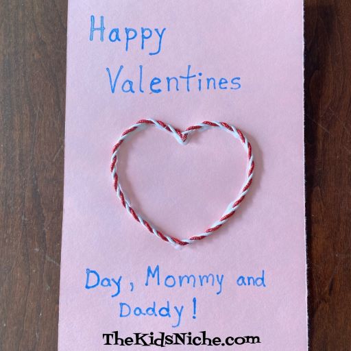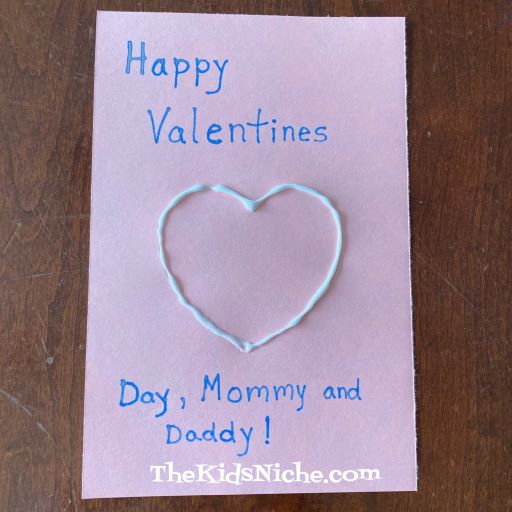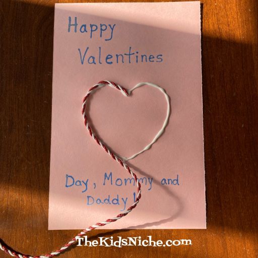 I had some other Valentine’s Day crafts in mind to do for you, but when I got sick with Covid, that all kinda went by the wayside. But I do have one more cute Valentine card idea for you that’s super quick and easy. You can make it as a decoration or a card. You’ll need a piece of construction paper (I used pink), some glue, pretty string or yarn, a pencil, markers or crayons and scissors. Begin by drawing a heart on your piece of construction paper. I used a heart shaped cookie cutter to trace around for my heart. (My apologies for the poor quality of pictures. I was coming down sick when I made this and didn’t feel up to moving around to find better lighting.)