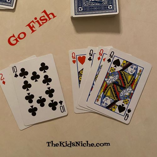 #2.) Go Fish. This game has been popular for a very long time and you probably already know how to play it. When playing Go Fish with a full deck of cards, you need to get 4 of each number for it to be a match. (Some actual Go Fish card games only need 2 matching cards for a match.)