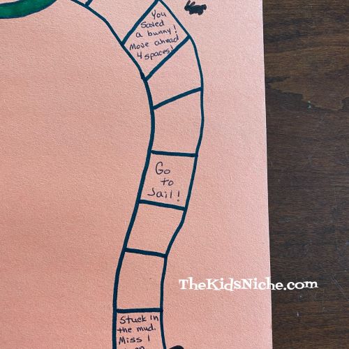 The rules for my game would be: Each player rolls the dice and the player that gets the highest number, goes first. Play will continue clockwise. When it is your turn, roll the dice one time and move your marker forward on the path that number of spaces. Do whatever the space says to do. If the space doesn’t have any instructions, your turn is finished. Continue playing in this manner with each player rolling the dice once, moving their marker ahead that number of spaces and doing what the space says to do. The first player to reach or go beyond the Finish space is the winner!