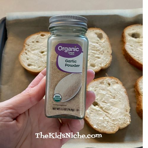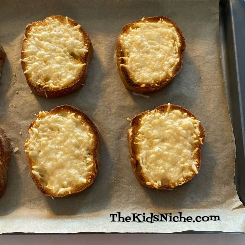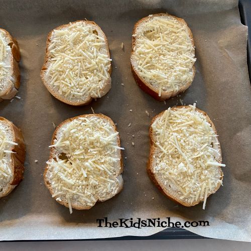 This snack only needs some butter, grated parmesan cheese and maybe garlic powder in addition to the bread. Another item that will make it extra tasty is some pasta sauce…but I’m getting ahead of myself! First cut the bread into slices and place them on a cookie sheet with some parchment paper covering the pan for easy clean up.