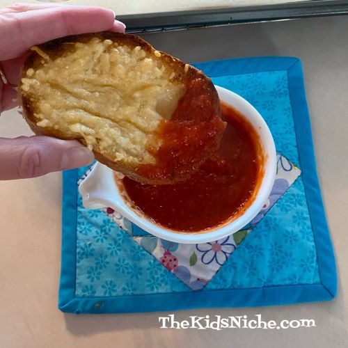 You can eat the Easy Cheesy Bread just like it is or for an added bonus, heat up some pasta sauce in a cup and dip your bread in it. MMmmm! So tasty!