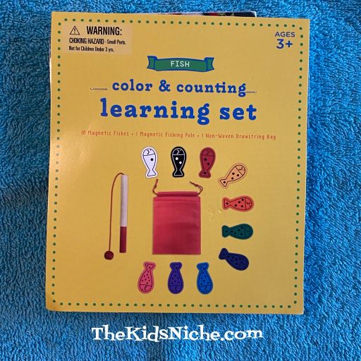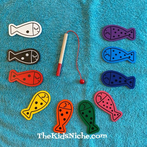 The little fishing pole has a magnet on the end and each fish has a little strip of metal on the backside of it. The idea is for your child to use the fishing pole to catch a fish and then say what color the fish is and/or count how many dots the fish has.