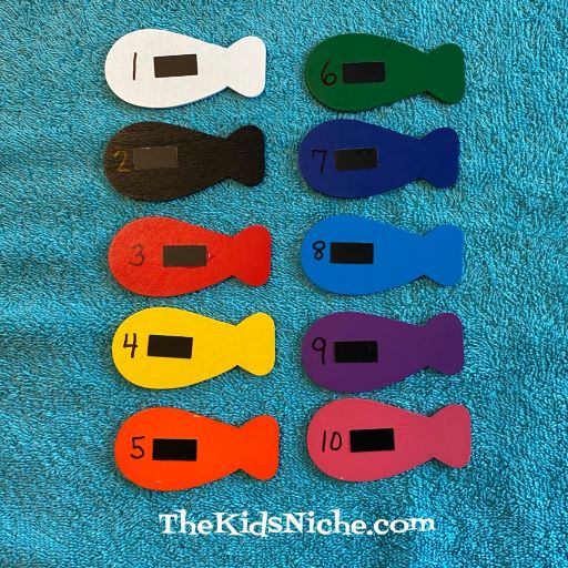 I added one thing to this game. I wrote the numbers on the backside of each fish so the kids playing can also see the number written to help them learn what the numbers look like.