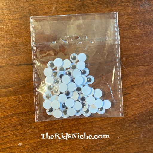 Here’s what you’ll need for this project: a black pom pom (I used a 2 inch size), 2 black pipe cleaners or chenille stems, some glue and 2 wiggly eyes. You will need to cut the pipe cleaners so a pair of wire cutters or a sturdy pair of scissors is helpful.