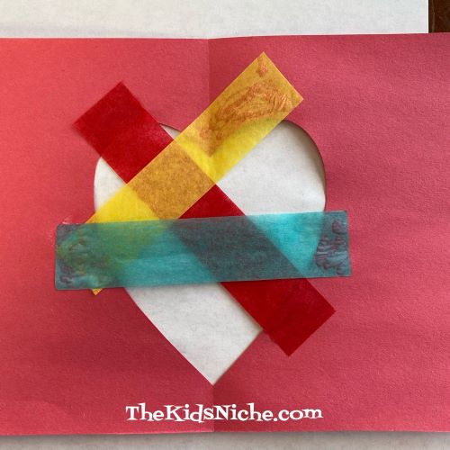 Unfold the 2 pieces. Place the side that you drew on facing up. This will become the backside of the stained “glass” heart. Using the strips of tissue paper, lay one across the heart opening and glue the ends down.