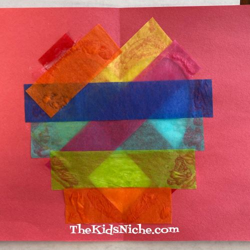 Take additional pieces of the tissue paper strips and place them, one at a time, in different directions over the heart opening…and glue the ends down.