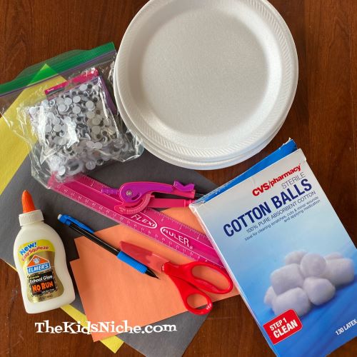 Supplies you’ll need include construction paper, pencil, ruler, 2 Styrofoam or paper plates, glue, scissors, wiggly eyes, a marker and cotton balls. A compass for drawing a circle will come in handy or a small bowl the size of the bottom of the plates you’ll be using works great.