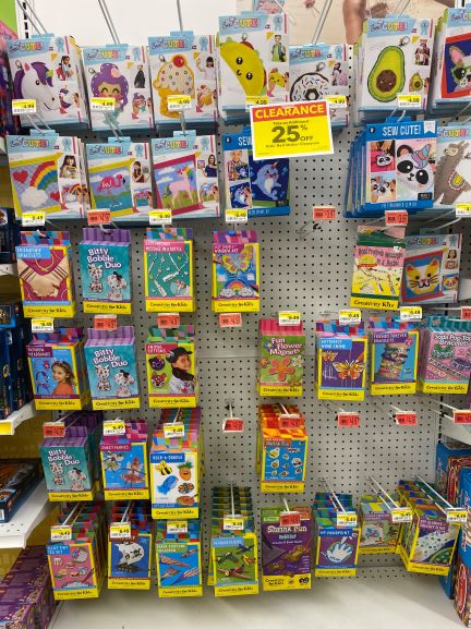 Also close by are more assorted craft kits, but be careful which ones you grab because not everything is on clearance. The clearance items will have a red clearance sticker on their hook.