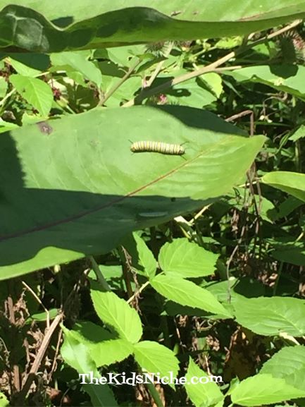 The eggs are so small that its easy to miss seeing them on the leaves. Be sure to look at the underside of the leaf too. When a Monarch caterpillar hatches, they are very tiny. See if you can find the little guy in this picture. The little black dots are caterpillar poop or frass.