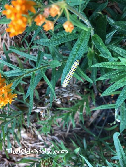 If you find a Monarch caterpillar, you can bring him inside and fix a nice little place for him to grow until its time for him to turn into a chrysalis. (Butterflies make a chrysalis and moths make cocoons.) There are little pet houses available for purchase for around $6-$7 that work really well. Place a damp paper towel on the bottom of the cage, add a stick for climbing and some fresh milkweed leaves every 24 hours. Make sure the top of the cage has air holes but the holes shouldn’t be big enough for the caterpillar to climb through. They WILL escape if they can fit through the holes! 😉 A screen is a great thing to use.