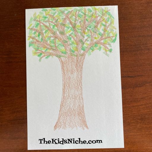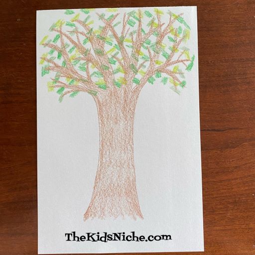 All you need is a piece of paper and a brown crayon and several different shades of green crayons. You might want to start out with a smallish sized piece of paper, say, around 6″ x 9″. A full sheet of paper for this tree could take quite a while to finish and therefore lose your child’s attention.