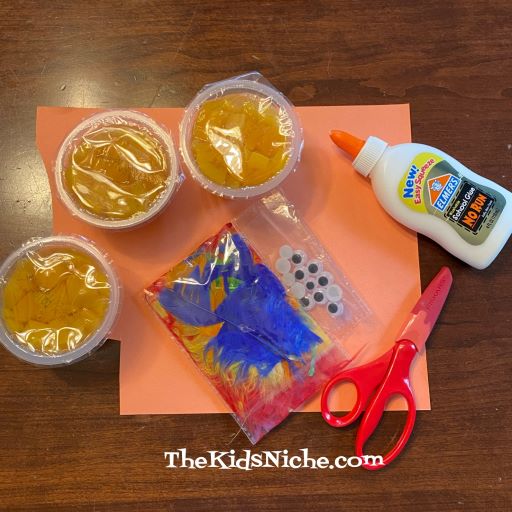 You will need some fruit cups, some orange construction paper, some fake feathers, some wiggly eyes, a pencil, scissors and glue. We found out by trial and error that using a glue gun works the best and keeps everything in place better than regular Elmer’s glue.