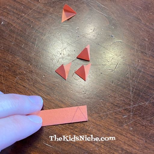 Fold a small piece of orange construction paper in half. Draw a triangle on the paper with one side of the triangle being on the fold. Cut out the triangle. This will be the chick’s beak.
