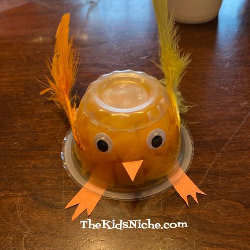 Glue on 2 wiggly eyes just above the beak. Glue a feather on each side of the fruit cup. You will definitely need to use a glue gun for the feathers.