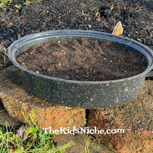 Using a nail and a hammer, make a few holes in the bottom of your pan or pot so it can drain excess water. Then add some dirt or potting soil so the container is nicely full but the dirt doesn’t come all the way to the top. Leave a little room at the top so the water doesn’t just run off but stays in the pan.