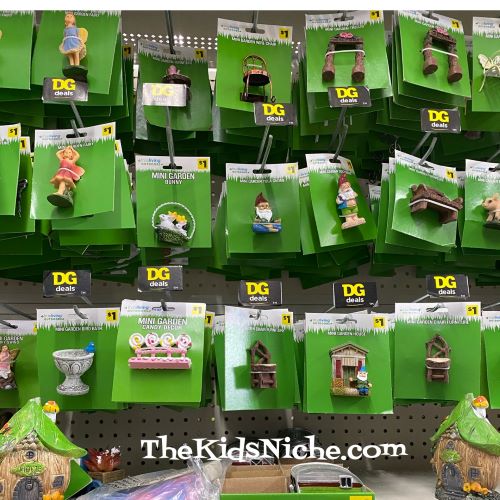 A great place to find fairy garden figurines is a Dollar General store. They had a whole section of things great for fairy gardens and they were priced at $1.00 each! Other stores like Joann Fabrics or Walmart have fairy garden figurines too, but they are more expensive.