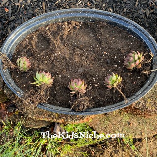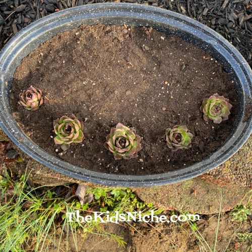 There are different kinds of plants you can get for this project and some stores even have them labeled as good for fairy gardens. I’m using some Hens and Chicks succulents for mine.