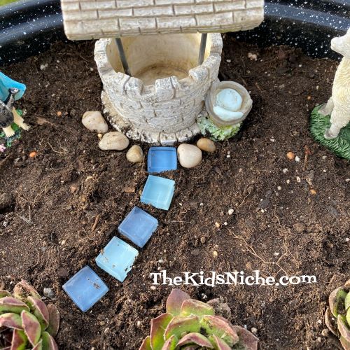 Now place the fairy garden figurines into your garden. Arrange any little stones that you want to use in place now too. You can make a little walking path, if you like.