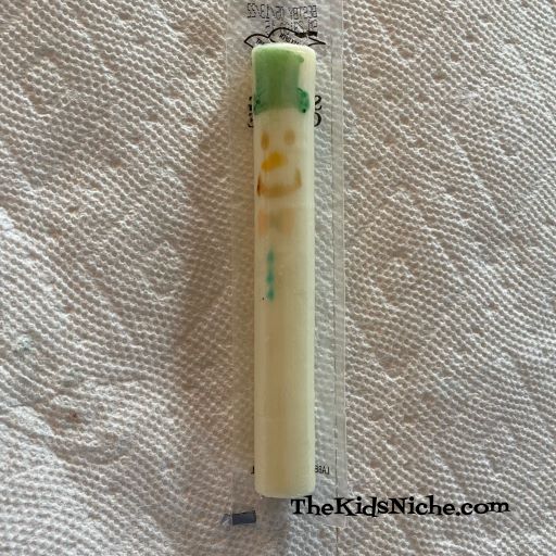 Using some permanent markers, all you do is draw a snowman on the side of the string cheese that has less words printed on it. If your kids are working on this project, I suggest putting some newspaper or paper towels under their work. You can design your snowman in any way you like. Add a hat, eyes, nose, mouth, bow tie or scarf and some buttons on his tummy.