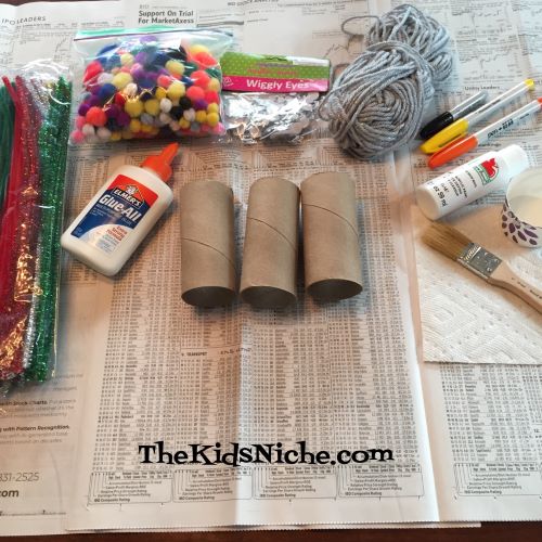 You will need some shaving cream (I used Barbasol), some Elmer’s glue, 2 big wiggly eyes, a piece of cardstock (a darker color shows up the best), some brown or black pipe cleaners, 3 small black pom poms or buttons and some colored paper. (You can make the snowman parts all out of colored paper if you’d like to.) You will need a bowl and spoon for mixing and a disposable bowl and spoon works best for easy cleanup.